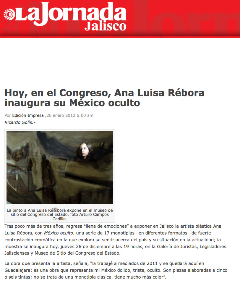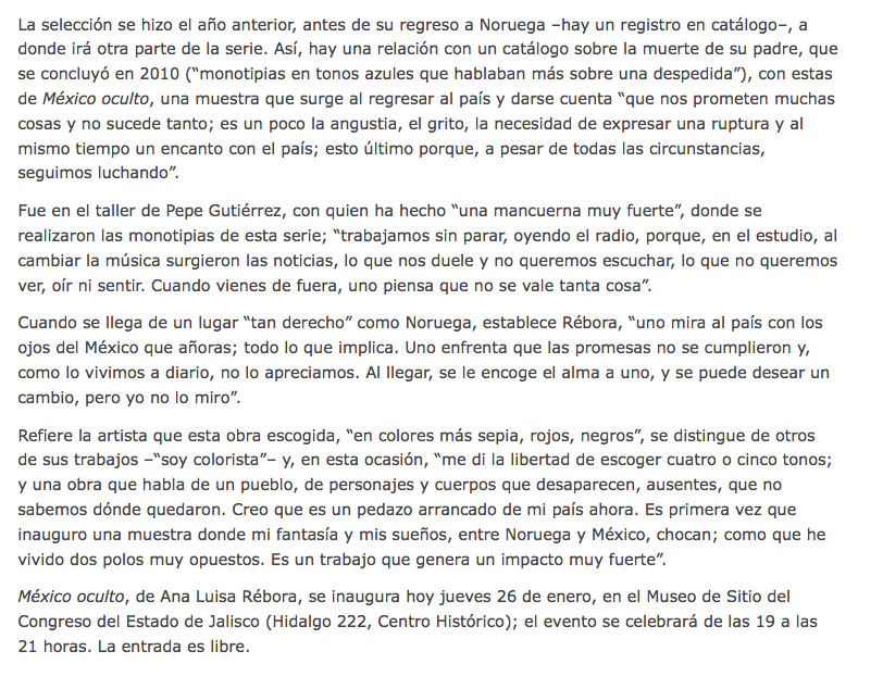 Las palabras de Hermann Bahr sacuden nuestra mente como si hubieran sido escritas ayer mismo y hoy me sirven de motivo para hablar sobre el trabajo reciente de Ana Luisa Rébora, artista nacida en estas latitudes pero que por circunstancias de la vida ha tenido que tomar distancia geográfica. Es precisamente el distanciamiento geográfico el que lleva a Rébora a observar con conciencia y con dolor una realidad que para nosotros se pierde en lo cotidiano.